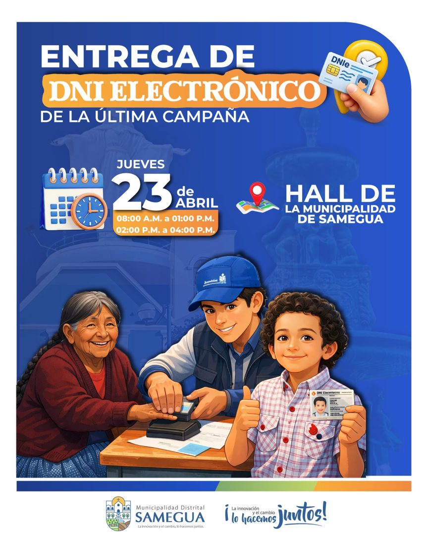 La municipalidad distrital de Samegua, informa a la poblaci贸n beneficiaria de la 煤ltima campa帽a de DNI electr贸nico que se realizar谩 la entrega oficial este 饾椃饾槀饾棽饾槂饾棽饾榾 饾煯饾煰 饾棻饾棽 饾棶饾棷饾椏饾椂饾椆.