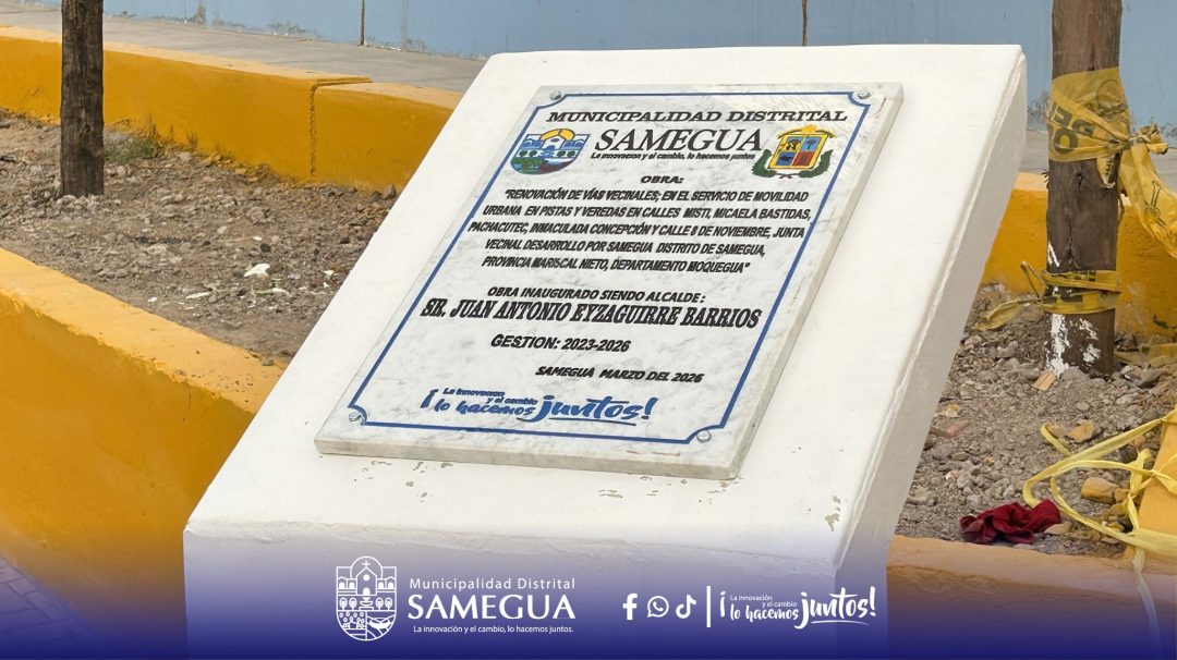La municipalidad distrital de Samegua, llevó a cabo la gran inauguración del proyecto IOARR “Renovación de vías vecinales en el servicio de movilidad urbana en pistas y veredas”, ejecutado en las calles Misti, Micaela Bastidas, Pachacútec, Inmaculada Concepción y 8 de Noviembre, pertenecientes a la Junta Vecinal Desarrollo por Samegua; una obra que mejora la transitabilidad, seguridad y calidad de vida de nuestros vecinos.